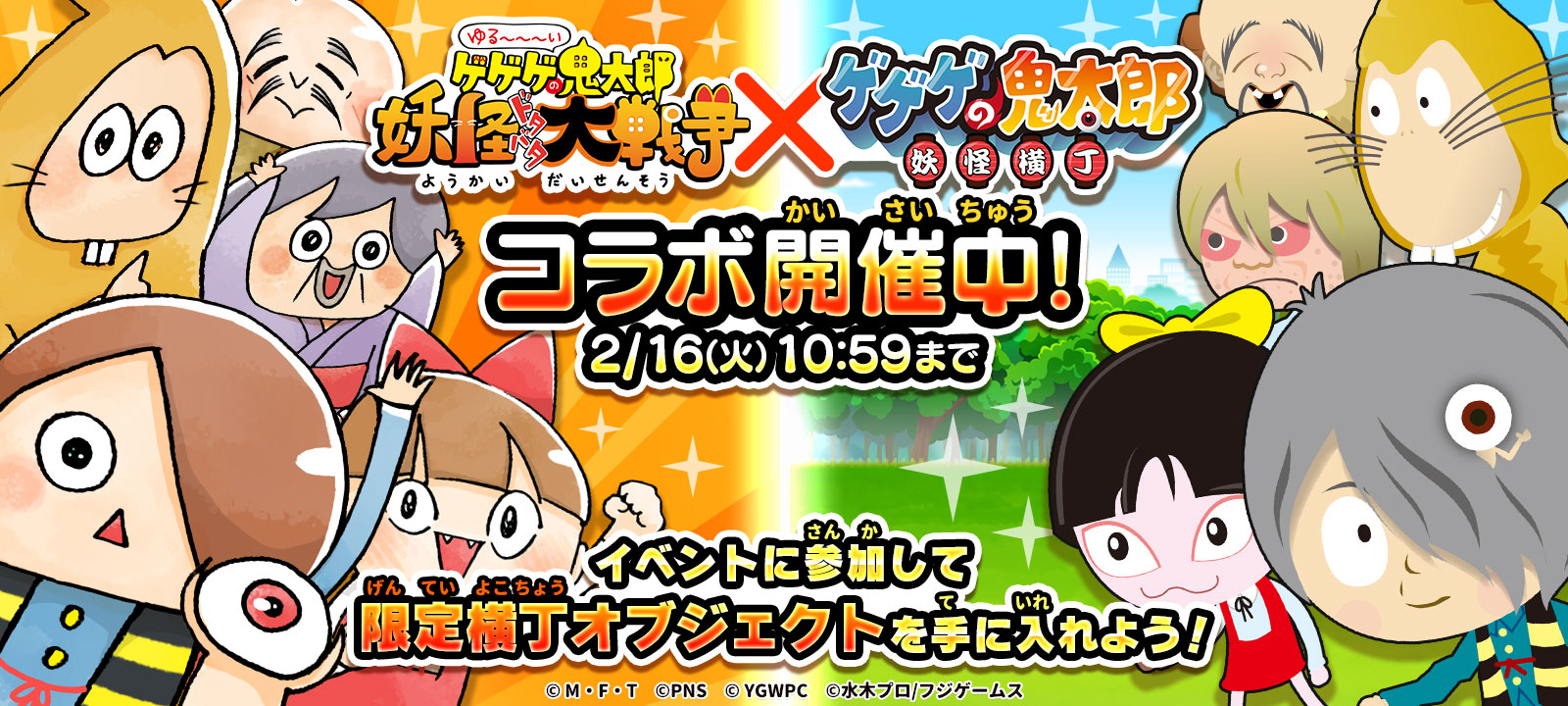 ゆるゲ大戦争製作委員会(配信・企画:東映アニメーション株式会社、企画・開発・運営:ポノス株式会社)は、人気アニメ『ゲゲゲの鬼太郎』を題材としたスマートフォン向けゲーム『ゆる~いゲゲゲの鬼太郎 妖怪ドタバタ大戦争』(略称:ゆるゲゲ)におきまして、株式会社フジゲームスが運営する『ゲゲゲの鬼太郎 妖怪横丁』とのコラボイベントの開始をお知らせいたします。