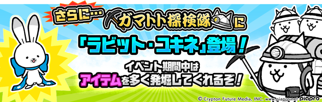 イベント期間中、「ガマトト探検隊」に「雪ミク」のペットであるキャラクター「ラビット・ユキネ」が新登場し、探検時にゲットできるアイテム量がアップします。