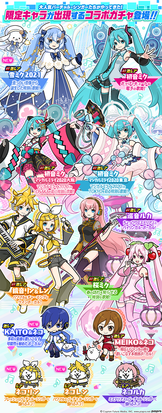 ポノス株式会社(本社:京都府京都市、代表取締役:辻子依旦、以下「ポノス」)は同社のスマートフォン向けゲームアプリ「にゃんこ大戦争」において、クリプトン・フューチャー・メディア株式会社(札幌市中央区)の人気キャラクター「初音ミク」および同シリーズの人気バーチャル・シンガーとのコラボレーションイベントを2021年2月15日(月)11:00より開始いたしましたので、これをお知らせいたします。