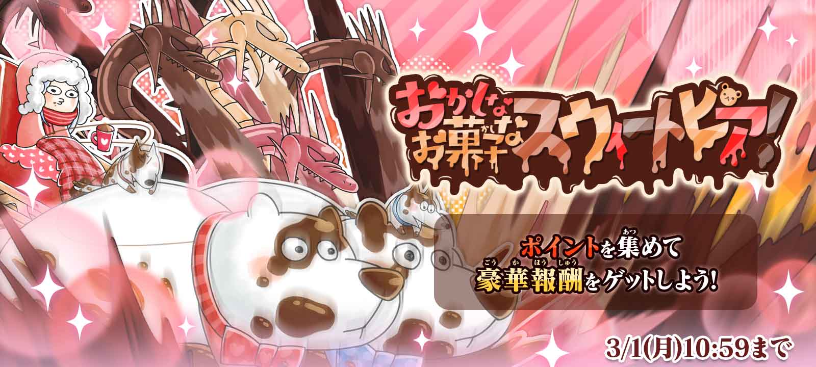 限定超激レア「ヤマタノドルチェ」と「チョコベア決死隊」の新登場に加え、2020年のバレンタインに登場した超激レアが再登場、さらに復刻激レアの出現確率がアップし、10回ガチャは何度でも限定超激レア1体確定の「バレンタインガチャ」を開催いたします。