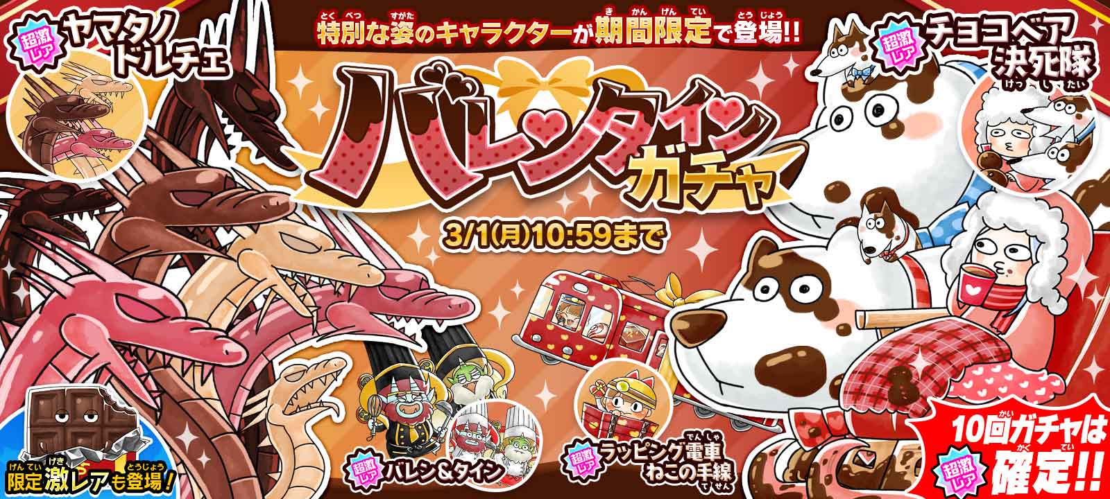 限定超激レア「ヤマタノドルチェ」と「チョコベア決死隊」の新登場に加え、2020年のバレンタインに登場した超激レアが再登場、さらに復刻激レアの出現確率がアップし、10回ガチャは何度でも限定超激レア1体確定の「バレンタインガチャ」を開催いたします。