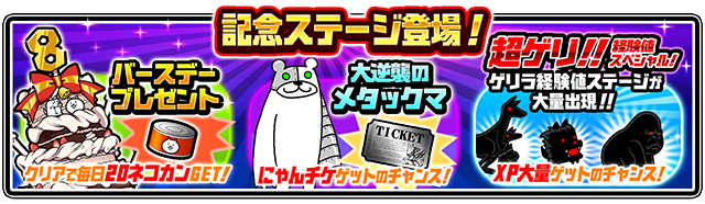 ステージクリアでにゃんこチケットがゲットできる「大逆襲のメタックマ」ステージ、およびステージクリアで経験値が大量ゲットできる「超ゲリ経験値スペシャル」を開催いたします。