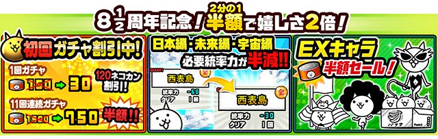 8と1/2周年記念!1/2で嬉しさ2倍!日本編、未来編、宇宙編の必要統率力が半減!
