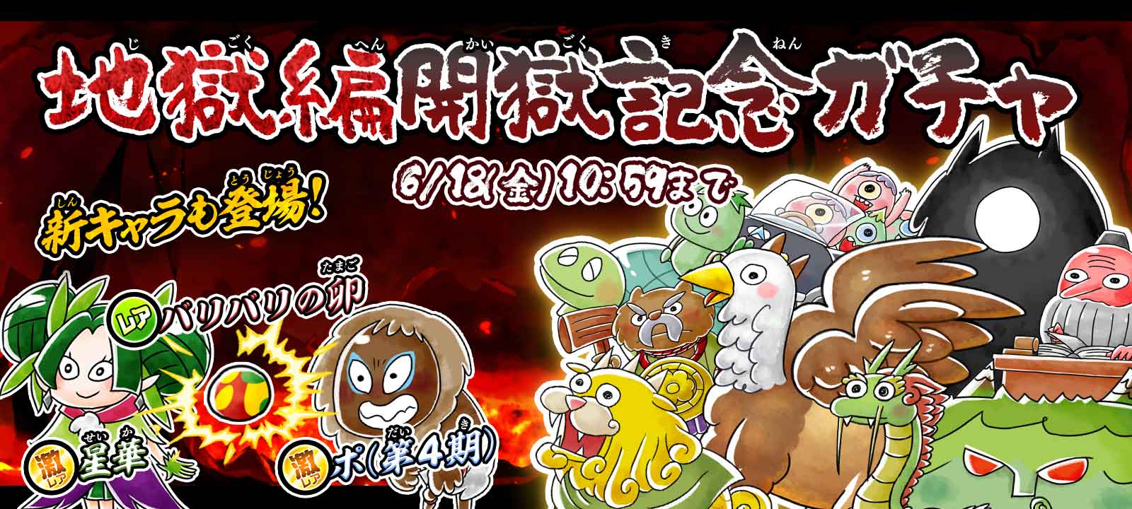 新激レア「星華」「ポ(第4期)」、新レア「バリバリの卵」が初登場に加え、地獄編で役に立つキャラクターが勢揃いな『地獄編開獄記念ガチャ』を開催いたします。また、初回10回ガチャは超激レア1体確定です。