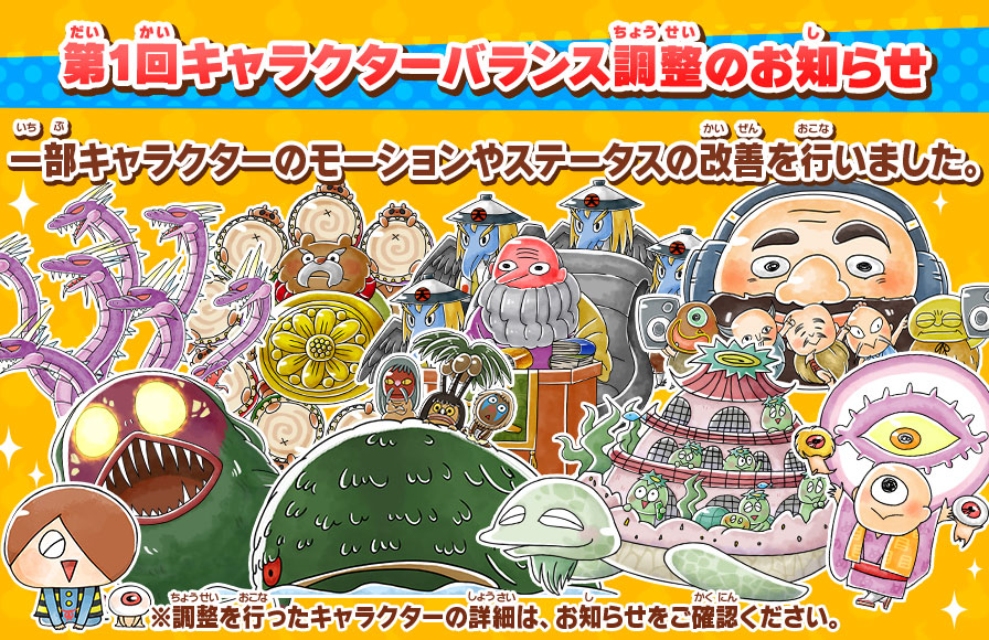 バランス調整の一例として、ゆるゲゲの初期から実装されていた「あたっか~」キャラクターの「ヤマタノオロチ」は、 『体力の上昇』・『出撃待ちの短縮』・『ノックバック数の減少』・『攻撃間隔の大幅縮小』といったステータスの調整が入ります。