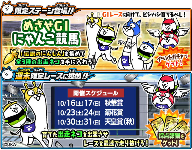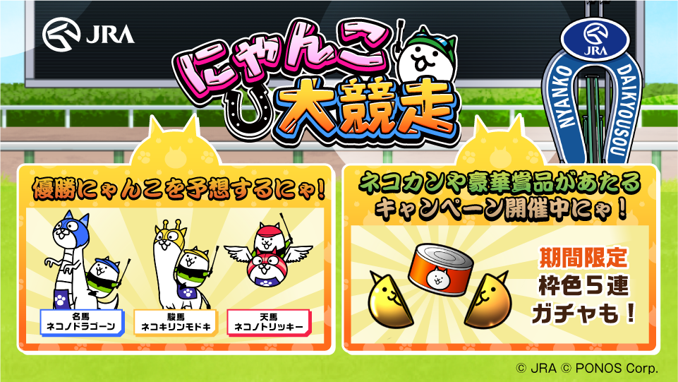 ポノス株式会社(本社:京都府京都市、代表取締役:辻子依旦、以下「ポノス」)が提供するスマートフォン向けゲームアプリ「にゃんこ大戦争」にて、「JRA(日本中央競馬会)」とのコラボイベントを2021年10月15日(金)より開始いたしましたので、これをお知らせいたします。
