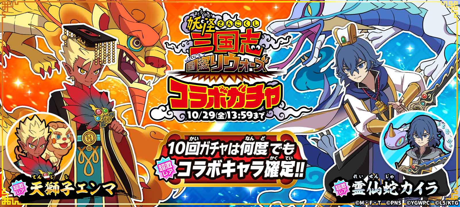 今回は『妖怪三国志』コラボの超激レア「獅子エンマ」「白蛇カイラ」も期間限定で追加されます!コラボ期間でしか登場しない限定超激レアキャラクターを手に入れられるこの機会をお見逃しなく。