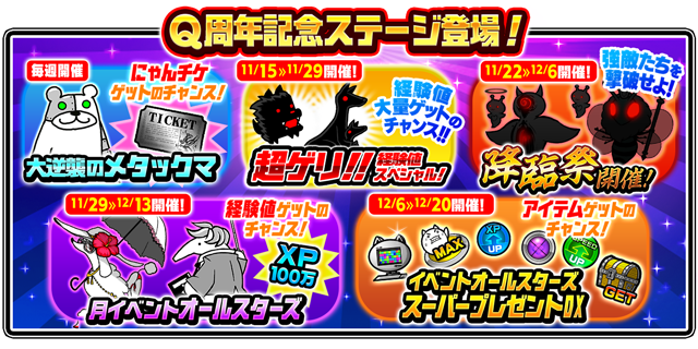ステージクリアでにゃんこチケットがゲットできる「大逆襲のメタックマ」や経験値が大量にゲットできる「超ゲリ経験値スペシャル」を開催いたします。
