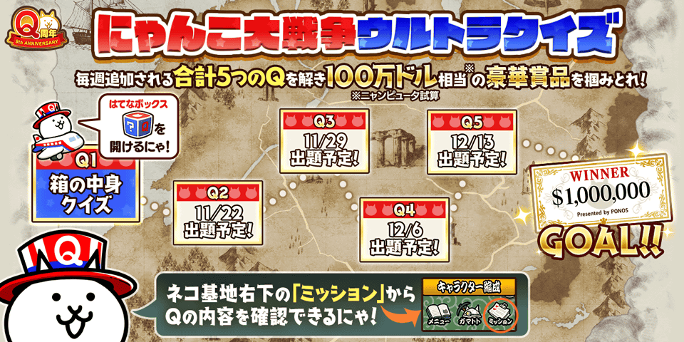 ポノス株式会社(本社:京都府京都市、代表取締役:辻子依旦、以下「ポノス」)は同社のスマートフォン向けゲームアプリ「にゃんこ大戦争」9周年を記念して、2021年11月15日(月)11:00より「Q周年記念イベント」の第1弾を開催いたしますので、これをお知らせいたします。