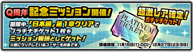 下記期間中に「日本編」第1章をクリアすることでプラチナチケットを1枚ゲットできるQ周年記念ミッションが登場いたします。既にクリアしているユーザーの方も入手できますので、ぜひチェックしてください。
