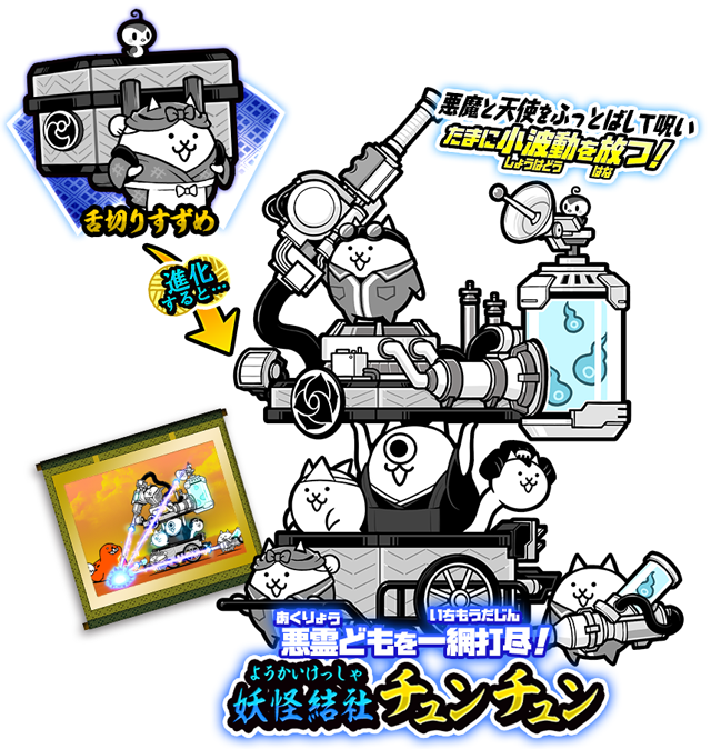 進化で変貌する古代勇者たちが集結する「古代勇者ウルトラソウルズ」に、新キャラクター「舌切りすずめ」が参戦します。進化すると、悪魔と天使を100%ふっとばして呪い、たまに小波動を放つ能力のキャラクター「妖怪結社チュンチュン」に変身!