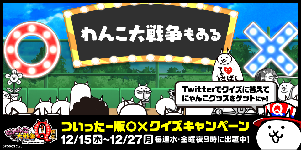 ポノス株式会社(本社:京都府京都市、代表取締役:辻子依旦、以下「ポノス」)は同社のスマートフォン向けゲームアプリ「にゃんこ大戦争」9周年を記念して、2021年12月13日(月)11:00より「Q周年記念イベント」の第3弾を開催いたしますので、これをお知らせいたします。