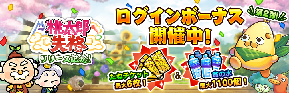 「ツルの恩返し」イベントログインボーナスと併せて、『桃太郎失格』の進行に便利なアイテムをゲットできるチャンスとなっておりますので、この機会をお見逃しなく。