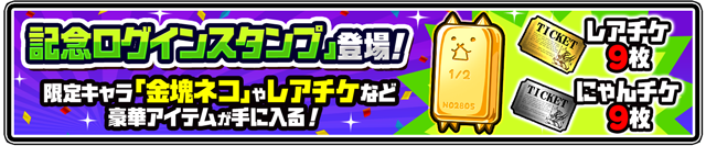 また、期間中に30日間ログインで限定EXキャラ「金塊ネコ」をゲット!忘れずにログインしましょう!
