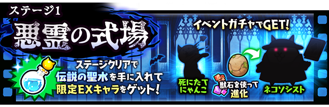 「伝説の聖水」を集めて限定EXキャラ「死にたてにゃんこ」や、第3形態で「ネコソシスト」に進化する「古びたタマゴ:N201」などをゲットしましょう。