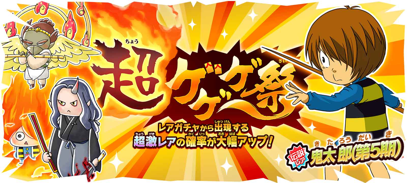 「超ゲゲゲ祭」は超激レアの出現確率が大幅アップするのに加え、限定超激レア「鬼童・伊吹丸」「きたろう:地獄の炎」や「迦楼羅」が登場する特別なガチャです。さらに初回10回ガチャは超激レア確定のため、限定キャラクターを手に入れる大チャンスです。