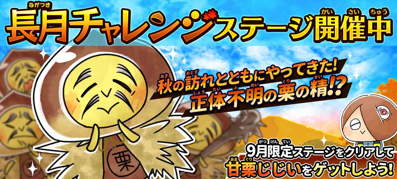 クリア時に一定の確率でSPキャラクター「甘栗じじい」が手に入る、9月限定ステージを開催いたします。