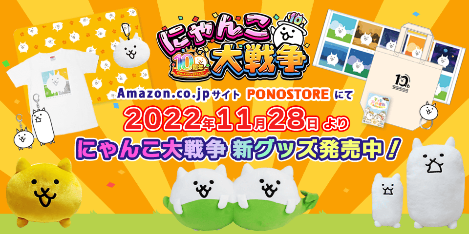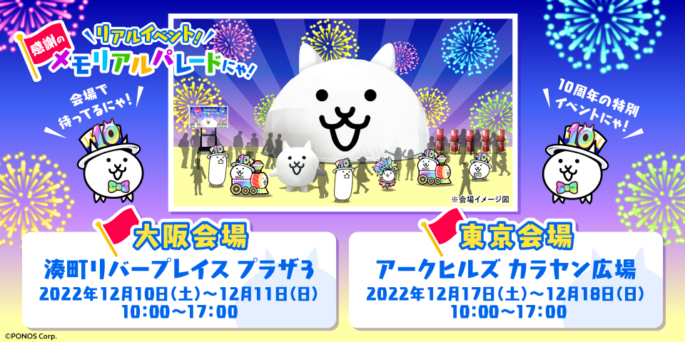 ポノス株式会社(本社:京都府京都市、代表取締役:辻子依旦、以下「ポノス」)は同社のスマートフォン向けゲームアプリ「にゃんこ大戦争」10周年を記念して、2022年11月29日(火)11:00より「10周年記念イベント」の第2弾を開催いたしますので、これをお知らせいたします。