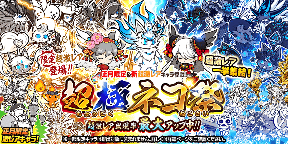 超激レア出現率最大アップのお正月限定レアガチャイベント「超極ネコ祭」を開催いたします。
