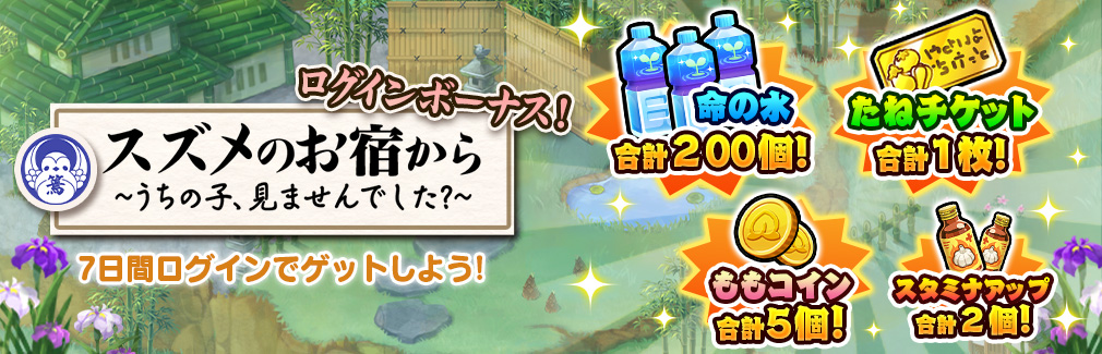 「スズメのお宿から」の開催に合わせて、豪華報酬が手に入るログインボーナスを開催いたします。
