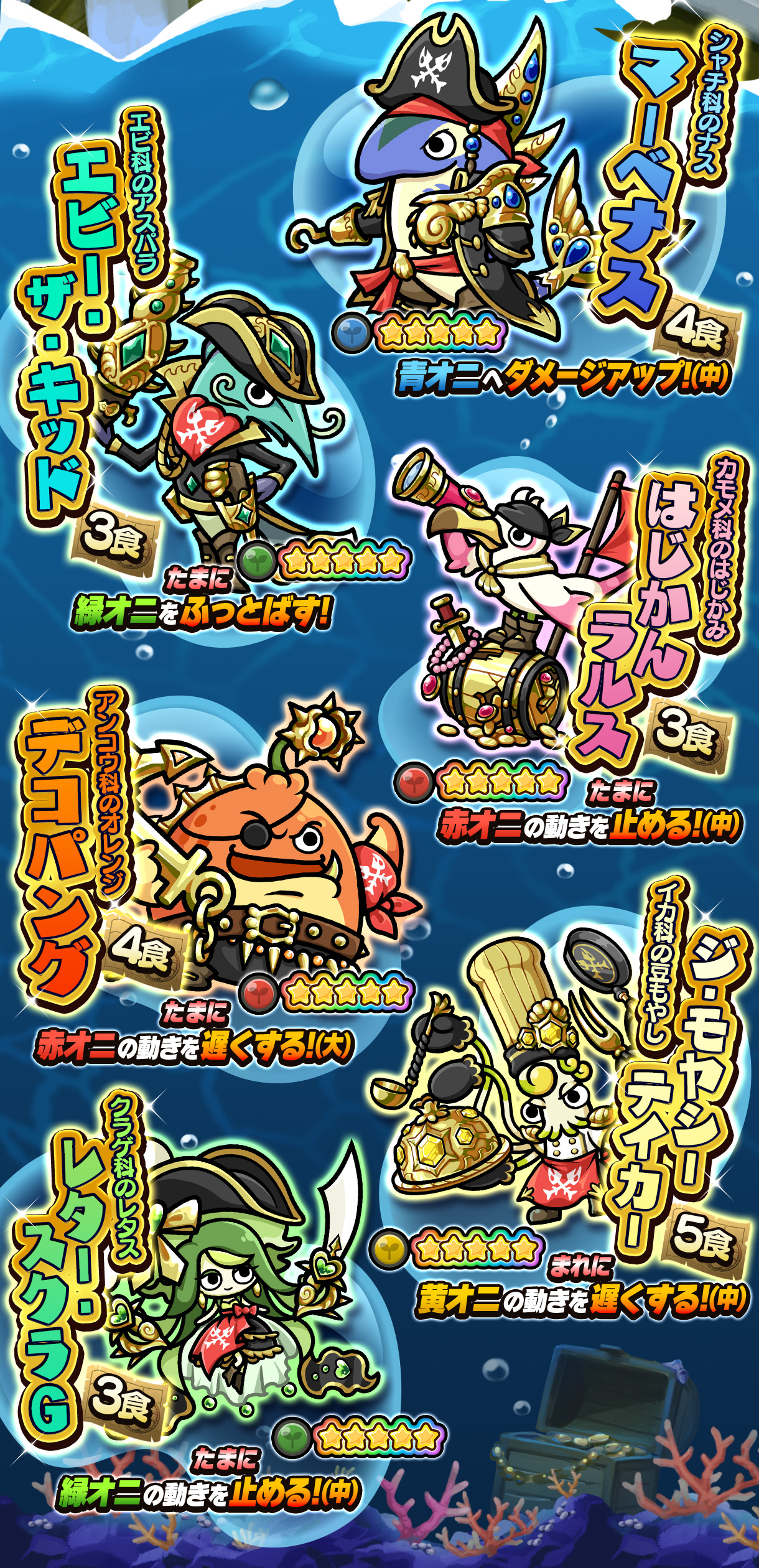 海のギャングとされる様々な海洋生物に似たベジ丸が目玉キャラとして6体登場いたします。