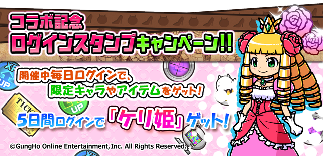 5日間ログインでコラボ限定EXキャラクター「ケリ姫」を入手できます。