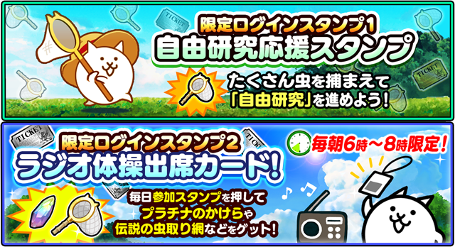 「なつやすみの自由研究ログインスタンプ」は毎日ログインすることで、にゃんチケやレアチケ、「伝説の虫取り網」などがゲットできます。