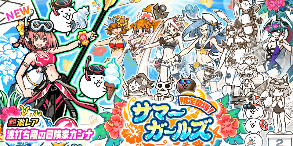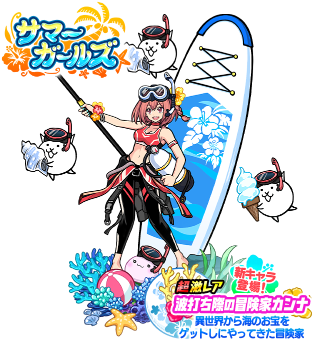 真夏のキュートな魅力満載「サマーガールズ」ガチャに、新たなる超激レアキャラクター「波打ち際の冒険家カンナ」が参戦します。その他にもかわいい水着キャラたちが登場!