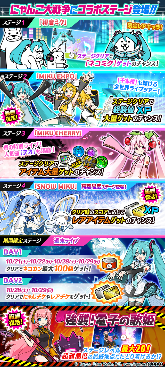 ポノス株式会社(本社:京都府京都市、代表取締役:辻子依旦、以下「ポノス」)は同社のスマートフォン向けゲームアプリ「にゃんこ大戦争」において、クリプトン・フューチャー・メディア株式会社(札幌市中央区)の人気キャラクター「初音ミク」および同シリーズの人気バーチャル・シンガーとのコラボレーションイベントを2023年10月18日(水)11:00より開始いたしましたので、これをお知らせいたします。