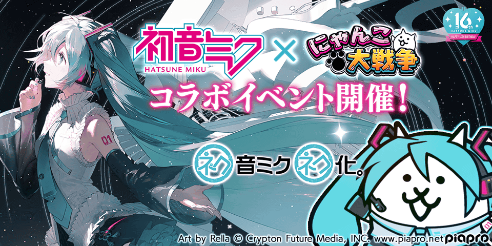 ポノス株式会社(本社:京都府京都市、代表取締役:辻子依旦、以下「ポノス」)は同社のスマートフォン向けゲームアプリ「にゃんこ大戦争」において、クリプトン・フューチャー・メディア株式会社(札幌市中央区)の人気キャラクター「初音ミク」および同シリーズの人気バーチャル・シンガーとのコラボレーションイベントを2023年10月18日(水)11:00より開始いたしましたので、これをお知らせいたします。