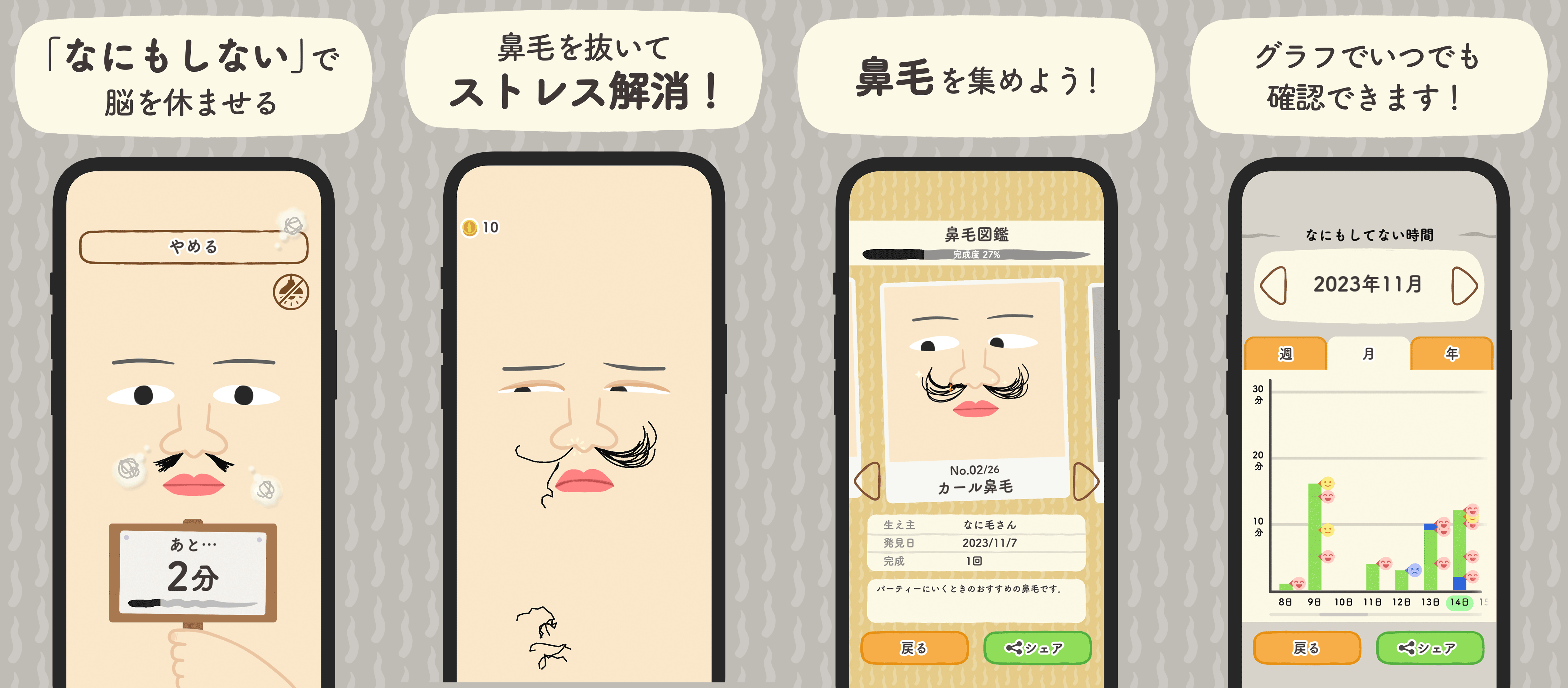 ポノスが送る新作アプリ『なにもしない。』は、なにもしないことを習慣にするためのエンタメンタルアプリです。(※エンタメンタルアプリとは「エンタテインメント」と「メンタルヘルス」を組み合わせた画期的なアプリのこと。画期的の定義には、諸説あります。)