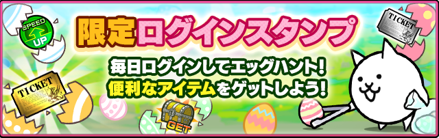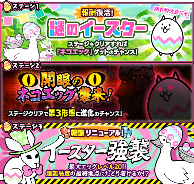「謎のイースター」では、ステージクリアで限定キャラクター「ネコエッグ」が極めてまれな確率で手に入り、「開眼のネコエッグ襲来!」では、ステージクリアで「ネコエッグ」を第3形態に進化させるチャンス!