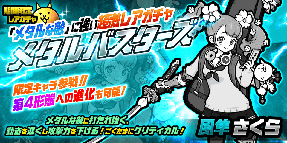 メタルな敵に強い超激レアキャラクターが集結した、期間限定レアガチャ「メタルバスターズ」を開催いたします。