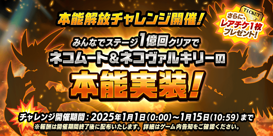 全ステージを対象に、みんなでステージをクリアした回数1億回達成で「ネコムート」と「ネコヴァルキリー」の本能実装!さらにレアチケット1枚がもらえるチャレンジイベントが開催!