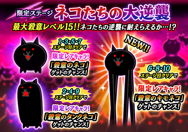 ステージをクリアすると限定キャラクター「殺意のネコ」「殺意のタンクネコ」「殺意のキモネコ」が、極めてまれな確率で手に入ります。