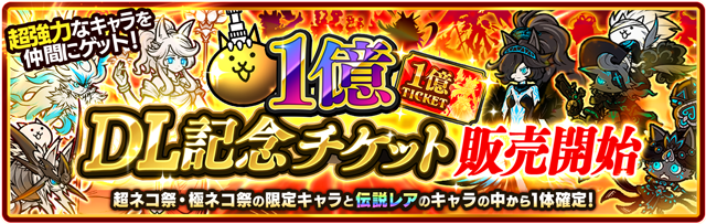 「1億DL記念ガチャ」では、超ネコ祭・極ネコ祭の限定超激レアキャラか伝説レアキャラの中から、1体が確定で手に入るぞ!
