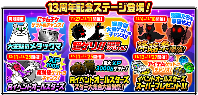 ステージクリアでにゃんこチケットがゲットできる「大逆襲のメタックマ」や、攻略に役立つアイテムがランダムでゲットできる「イベントオールスターズ スーパープレゼントDX」を開催いたします。