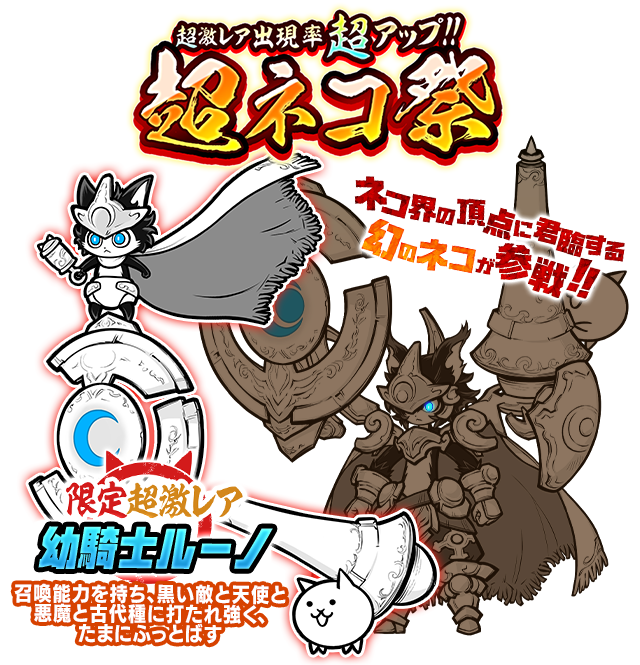 超激レア出現率が超アップするレアガチャ「超ネコ祭」に、新たな限定キャラクター「幼騎士ルーノ」が参戦します。
